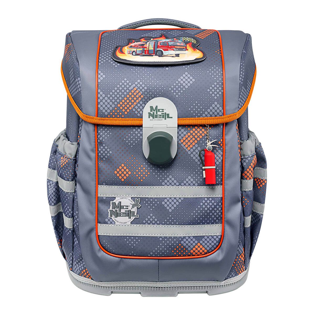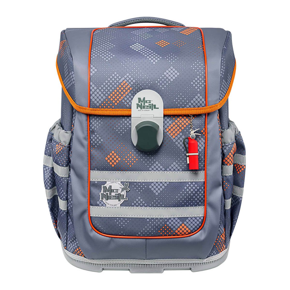 McNeill Schulranzen (grau, orange) - Das ergonomische Rückenpolster, die gepolsterten Schulterriemen mit retroreflektierenden Streifen und Samtvelourbesatz, der verstellbare Brustgurt und ein abnehmbarer Beckengurt machen den ERGO COMPLETE zu einem optimalen Ranzen. Der ERGO COMPLETE ist ausgestattet mit dem höhenverstellbaren SmartFlex Tragesystem für idealen Sitz. Der Schulranzen lässt sich mit dem Einhandmagnetschloss kinderleicht öffnen. Das Hauptfach verfügt über eine praktische Innenaufteilung mit einem Bücherfach. Am Überschlag besitzt der Schulranzen einen gepolsterten Tragegriff. Die zwei Vortaschen mit Organizer bieten zusätzlichen Stauraum. In den zwei dehnbaren Seitentaschen lassen sich Regenschirm und Trinkflasche sicher verstauen. Mit dem Schlüsselband lässt sich der Fahrradschlüssel sicher aufbewahren. Der standfeste und wasserabweisende Boden bietet Schutz vor Nässe. Eine Vielzahl reflektierender Elemente bieten Ihrem Schulkind zusätzliche Sicherheit im Straßenverkehr.