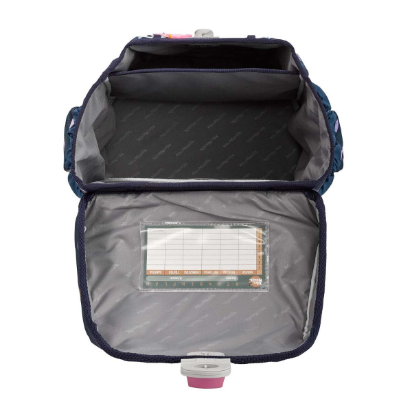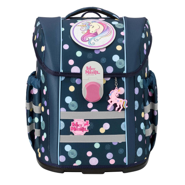 McNeill Schulranzen (blau, lila, pink, gelb, Punkte) - Der McNeill Mac2 ist ein besonders leichter Schulranzen und wirkt durch seine reduzierte Silhouette elegant und kompakt zugleich. Das ergonomische Rückenpolster, die gepolsterten Schulterriemen, der verstellbare Brustgurt und sein geringes Gewicht machen ihn zum optimalen Schulranzen, gerade für zierliche Kinder. Wie alle Schulranzen von McNeill ist der Mac2 mit dem SmartFlex Tragesystem ausgestattet. Der Schulranzen lässt sich kinderleicht öffnen. Das Hauptfach verfügt über eine praktische Innenaufteilung mit einem Bücherfach. Am Überschlag besitzt der Schulranzen einen gepolsterten Tragegriff. In den zwei dehnbaren Seitentaschen lassen sich Regenschirm und Trinkflasche sicher verstauen. Eine integrierte Vortasche bietet Platz für Kleinigkeiten. Der standfeste und wasserabweisende Boden bietet Schutz vor Nässe. Eine Vielzahl reflektierender Elemente bieten Ihrem Schulkind zusätzliche Sicherheit im Straßenverkehr.