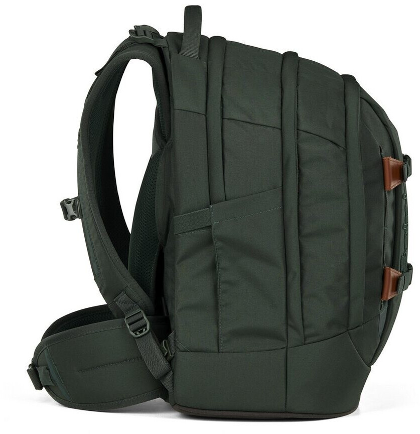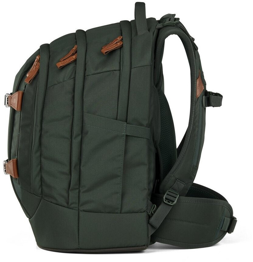 satch pack Schulrucksack (grün, dunkelgrün, Leder-Applikationen) - Der satch pack ist ein wahres Organisationstalent und bietet Ihnen die optimale Kombination innovativer Trekking Technologie mit den Besonderheiten eines Schulrucksacks. Der Schulrucksack ist durch sein cleveres Your-Size-System mit verstellbarer Rückenlänge optimal geeignet für eine Körpergröße von 1,40 m - 1,80 m. Ab der Kollektion 2025 besitzt der Rucksack das innovative 3D Soft-Mesh Rückensystem mit 3 Kammern und weicher Polsterung. Somit wird der Rücken entlastet und der Rucksack optimal an die Anatomie angepasst. Die atmungsaktive Rückenpolsterung mit innovativem Air-Flow Belüftungssystem und das Aluschienen-System bieten zusätzlichen Komfort und Stabilität. Der abnehmbare Hüftgurt garantiert die Verlagerung des Gewichts von den Schultern auf den stabilen Beckenbereich. Der Schulrucksack ist aufgrund seines Aufbaus mit einem höhenverstellbaren Brustgurt und der Entlastung des Rückens durch starke Beckenflossen am Hüftgurt, besonders ergonomisch. Ab der Kollektion 2025 wird der Beckengurt wieder über eine rückführende Bewegung angepasst. Die gepolsterten und verstellbaren Schultergurte und die Lastkontrollriemen gewährleisten eine ideale Lastverteilung auf den Schultern. Der Rucksack besitzt einen gepolsterten Tragegriff mit Soft-Touch-System ab der Kollektion 2025. Durch einen verstärkten Boden steht der Schulrucksack selbstständig. Das wasserabweisende Material bietet Schutz vor Feuchtigkeit und Schmutz. Zwei dehnbare Außenfächer bieten Platz für Trinkflasche und Regenschirm. Ab der Kollektion 2025 besitzt der pack breitere und höhere Seitentaschen und eine 3 Punkte Fixierung für den Sportbeutel (Sportbeutel nicht im Lieferumfang erhalten). Inklusive 2 austauschbare Frontswaps zur individuellen Gestaltung des Rucksacks. Ab der Kollektion 2025 mit der Möglichkeit 4 Swaps am Rucksack zu befestigen (zusätzliche Swaps sind nicht im Lieferumfang enthalten).