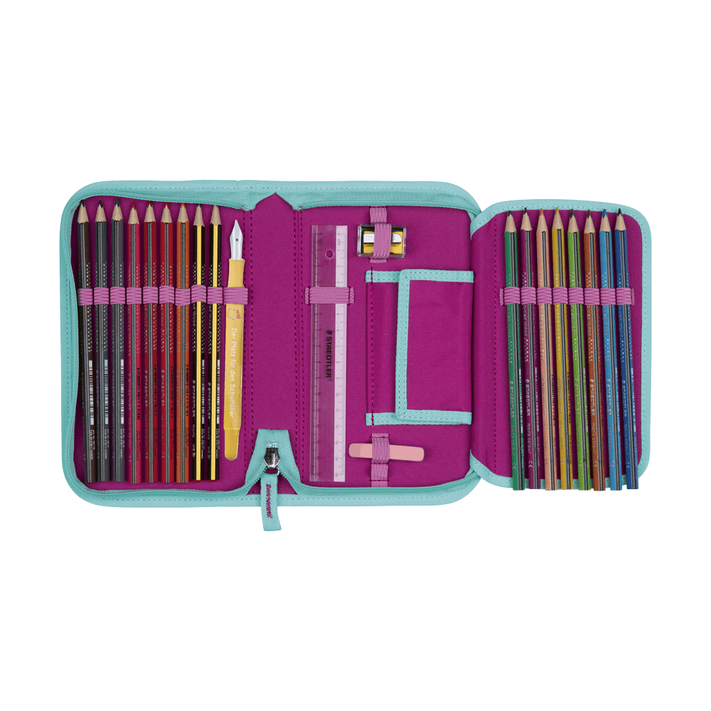 und einem befüllten Schüleretui (Staedtler-Qualitätsbuntstifte).