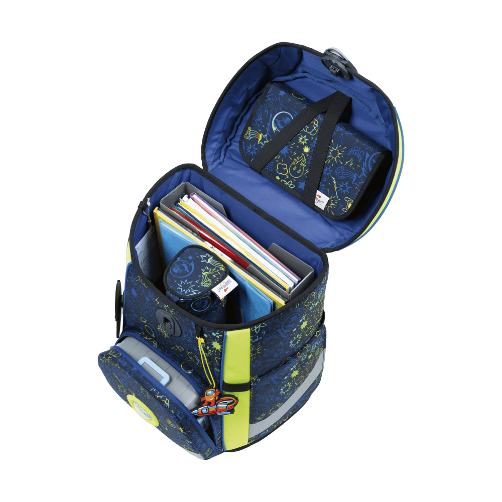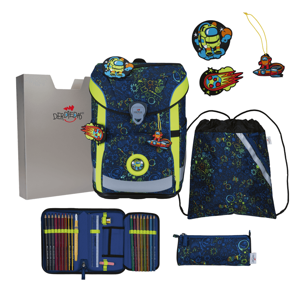 So komfortabel wie nie – der ErgoFlex Easy mit schlanker, aber fester Silhouette hat viel Platz für Bücher, Hefte & vieles mehr. Dabei wiegt er nur ca. 950 Gramm! Mit den weltraumstarken Wechselbuttons und dem Anhänger können Kinder den Ranzen individuell gestalten. So wird der Ranzen zum galaktischen Hingucker. Dank seines cleveren Tragegurtsystems wächst er mit und entlastet den Kinderrücken. Die großen retroreflektierenden Flächen sorgen für einen sicheren Schulweg. Das Beste aber ist: Der ErgoFlex Easy Neon Crazy Schulranzen kommt im praktischen Komplett-Set inklusive 2 Wechselbuttons und 1 Anhänger, Heftebox, Sportbeutel, Faulenzermäppchen und einem befüllten Schüleretui (Staedtler-Qualitätsbuntstifte). So macht Schule Spaß!
